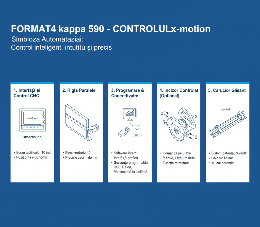 1. Interfață și Control CNC Operarea la ambele modele se realizează printr-un ecran tactil color de 10 inch (control smartouch), montat ergonomic la nivelul ochilor. Sistemul x-motion oferă:
