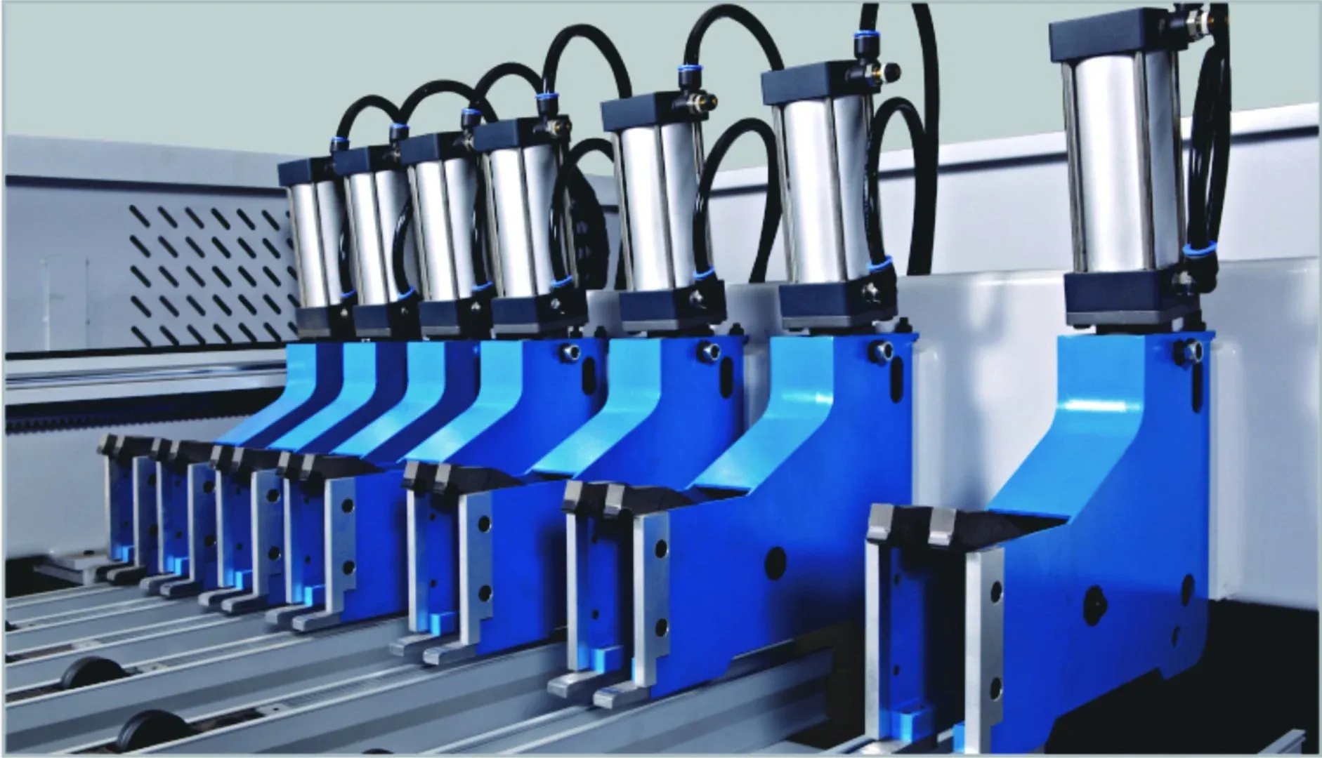 Carul de mare viteză este echipat cu 7 cleme pneumatice. Acestea utilizează designul special "deget dublu" (double finger), esențial pentru producția de volum mare. Această arhitectură asigură o prindere fermă și stabilă a pachetelor multiple de panouri, prevenind alunecarea foilor, chiar și la accelerațiile rapide ale împingătorului (120 m/min la retur).