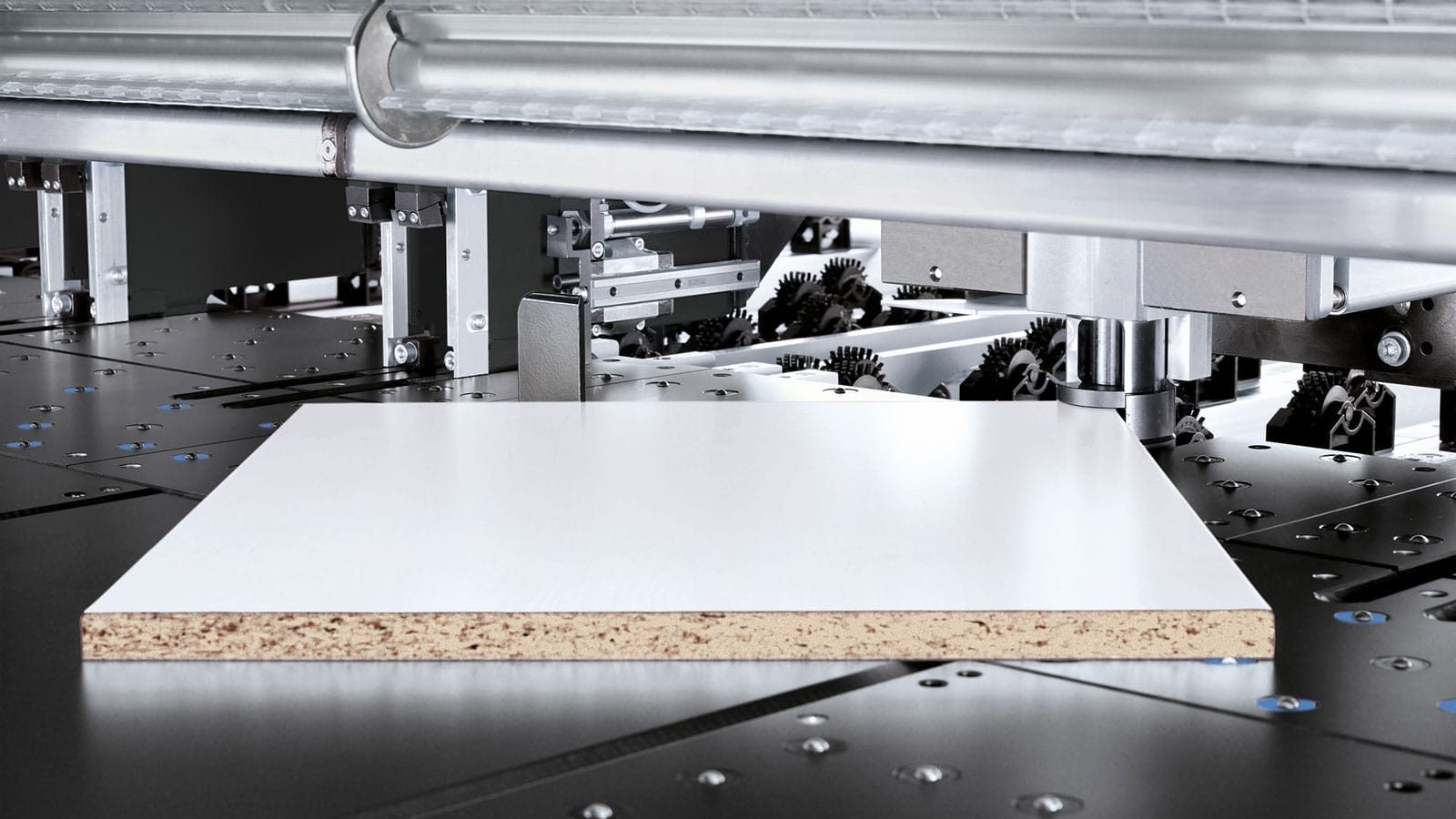 dustExutilizează jeturi de aer pentru a transporta praful și așchiile direct la rigla de unghi, îmbunătățind aspirația și protejând materialul. - Trasabilitate și Conectivitate: Dispune de un sistem de etichetare a panourilor (opțional) pentru identificarea detaliată și fără erori a pieselor. Controlul CADmatic 5 este pregătit pentru conectarea la Tapio și permite diagnosticarea vizuală a erorilor.