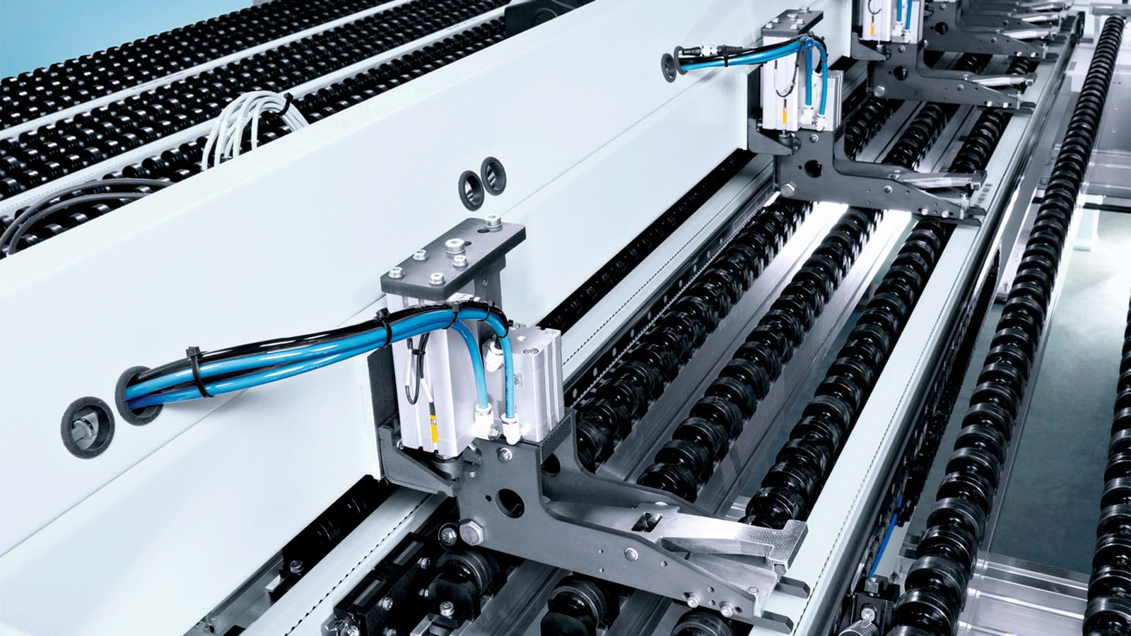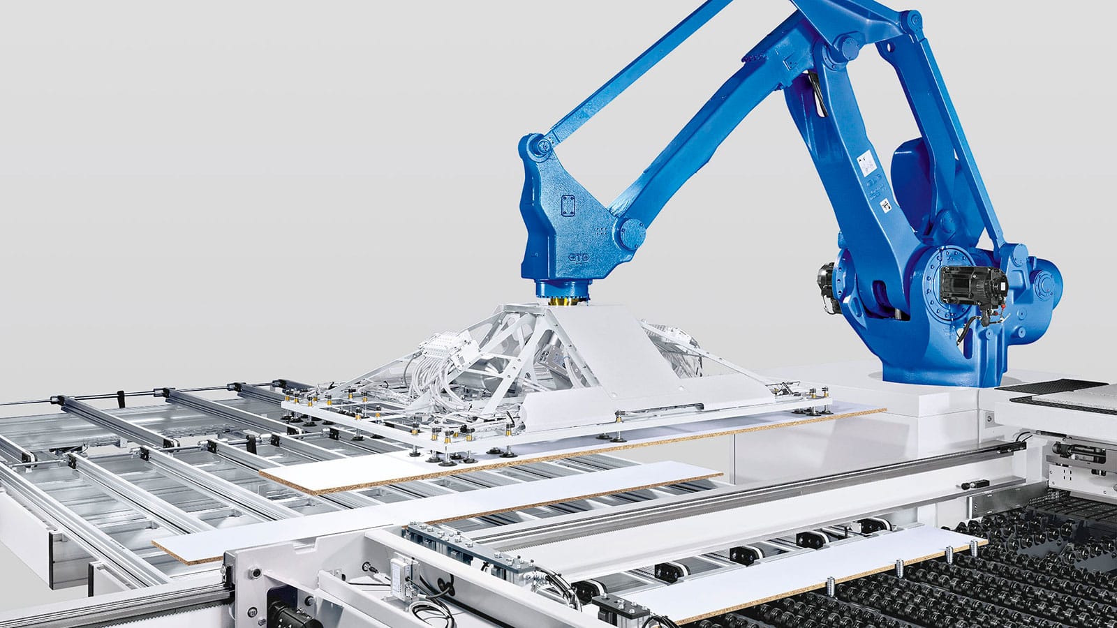 - Robotul și Traversa de Aspirare: Robotul, echipat cu o cruce de sucțiune (traversă de aspirare), realizează manipularea panourilor, fâșiilor și pieselor finite în mod automat, flexibil și precis.